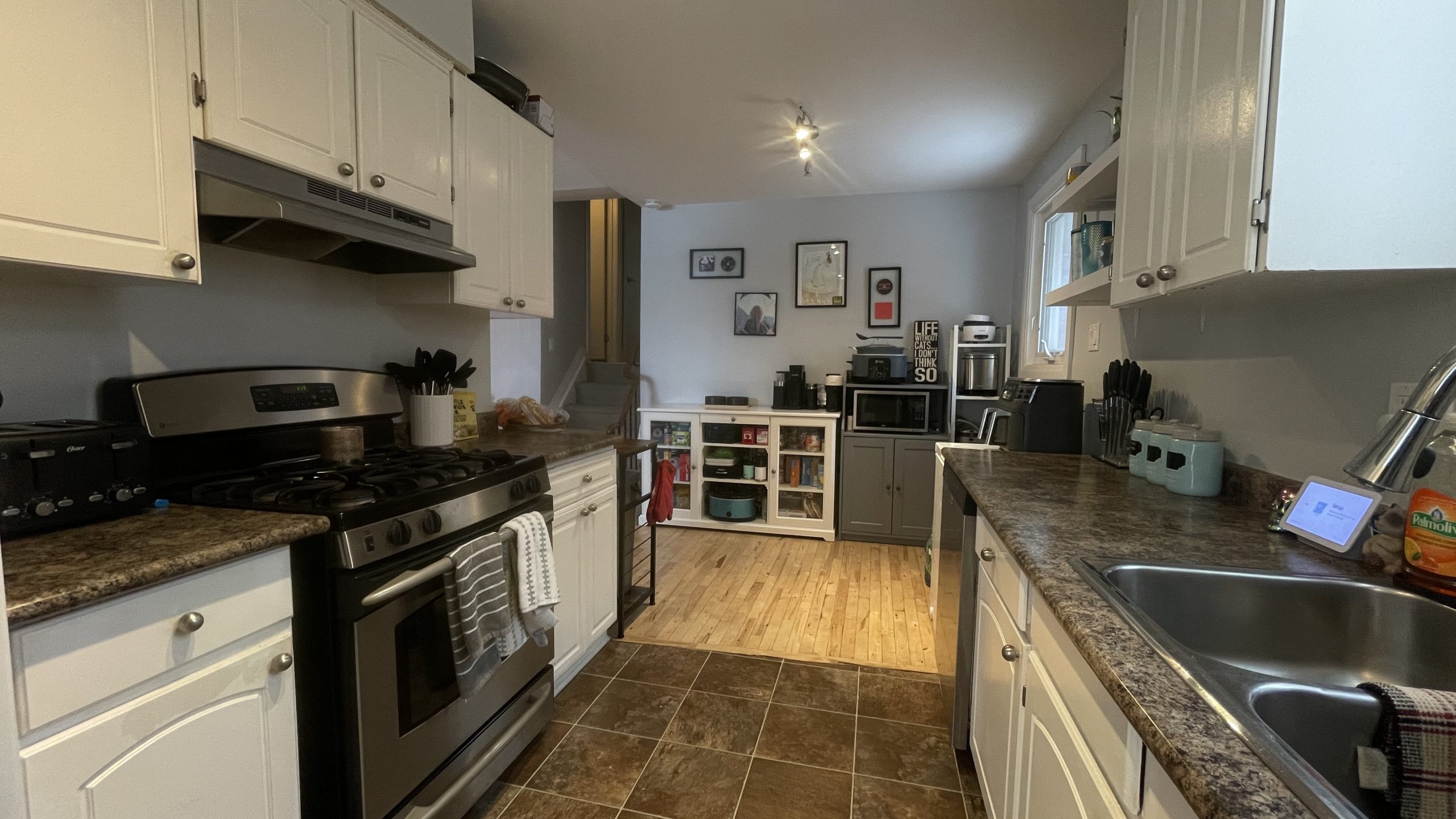 The upper level features hardwood floors throughout, a spacious living and dining area, and a functional galley kitchen.